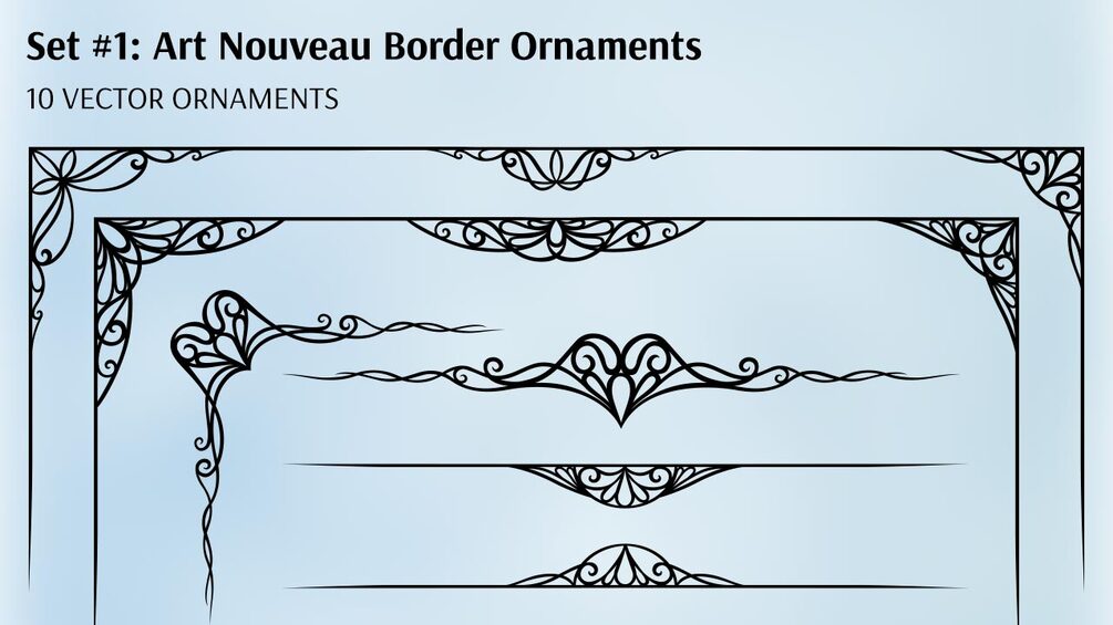 Contains 10 unique swirly Art Nouveau inspired borders reminiscent of wrought iron, 5 matching pairs of horizontal and corner ornaments. (Each may be rotated in any direction.)